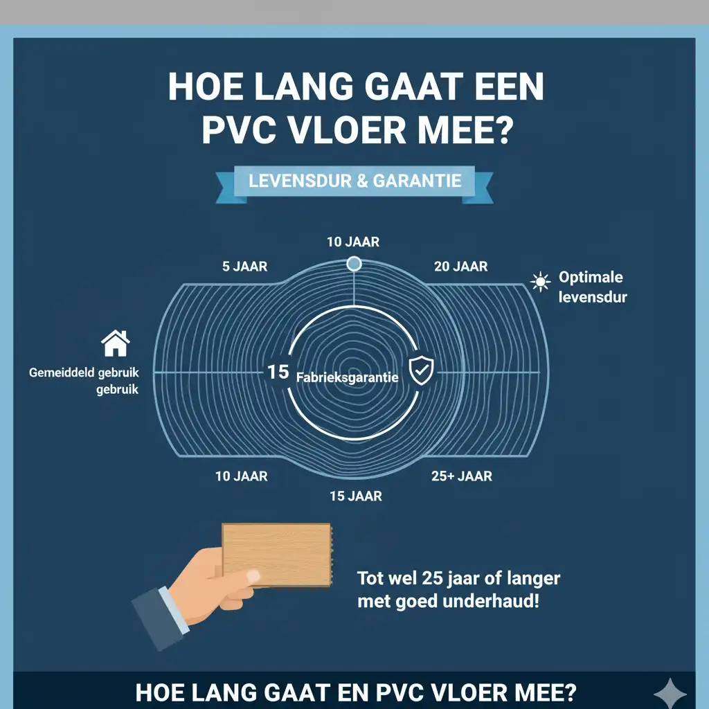 Een kwaliteits-PVC vloer kan 20 tot 30 jaar meegaan bij normaal gebruik. Fabrikant, dikte van de toplaag en gebruiksomstandigheden spelen een belangrijke rol. Woonkamers met normaal gebruik zien een langere levensduur dan drukbezochte commerciële ruimtes. De juiste installatie en regelmatig onderhoud verlengen de levensduur aanzienlijk, terwijl intensief gebruik zonder bescherming eerder slijtage veroorzaakt.