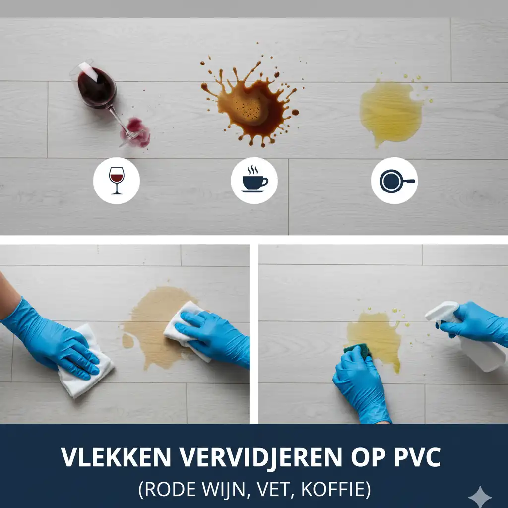 Rode wijn is een van de meest voorkomende en hardnekkige vlekken. Snel handelen is cruciaal. Dep de wijn direct op met keukenpapier en werk van buiten naar binnen om verspreiding te voorkomen. Meng vervolgens lauw water met een neutrale zeep en dep voorzichtig over de vlek. Spoel na met schoon water en droog de vloer grondig met een zachte doek. Voor oudere vlekken kan een PVC-vriendelijke speciale reiniger gebruikt worden. Door deze methode toe te passen, minimaliseer je het risico op verkleuring en blijft de vloer egaal van kleur.
